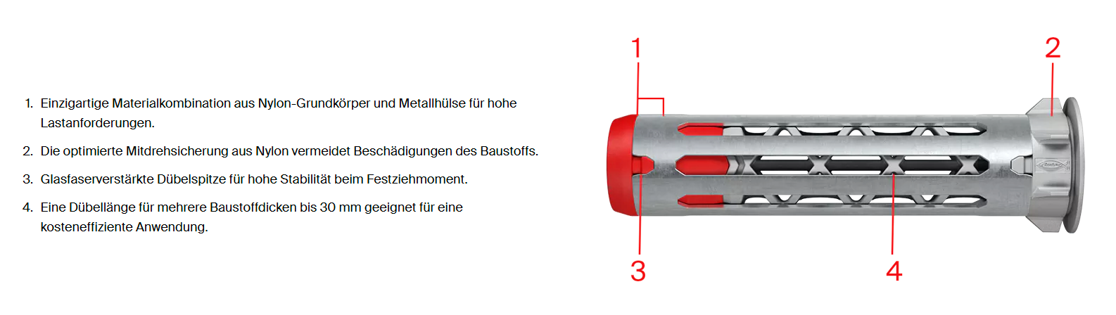 - Eine Dübellänge pro Durchmesser für alle gängigen Baustoffdicken