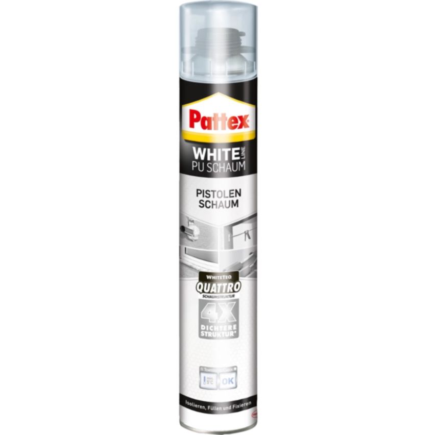- Reinweiße Schaumqualität | Der PATTEX White Line Bauschaum besitzt eine reinweiße Schaumqualität mit feiner, homogener Zellstruktur. Auch bietet er maximalen Schutz vor Verformungen.WhiteTeq Quattro Technologie | Dank der speziellen WhiteTeq Quattro Technologie besitzt der Füllschaum 4x mehr Zellen je Raumeinheit (1). Zusätzlich steht er mit 25% Flexibilität für hohe Langlebigkeit.